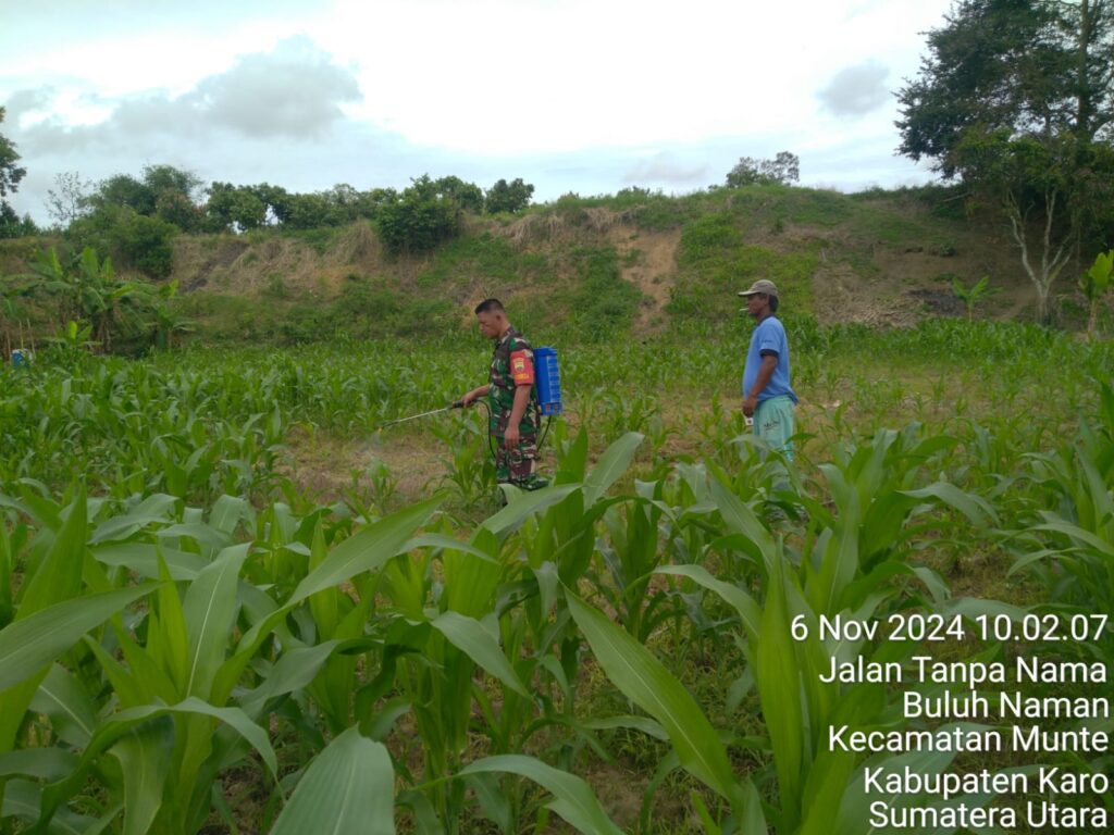 Koramil 06 Munte Komsos Bersama Petani Pengecekan dan Penyemprotan Racun Hama