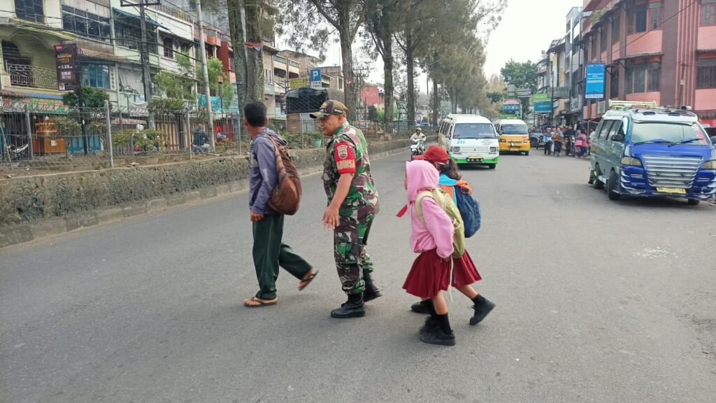 Koramil 03 Berastagi Bantu Pengamanan Penyeberangan Siswa Sekolah