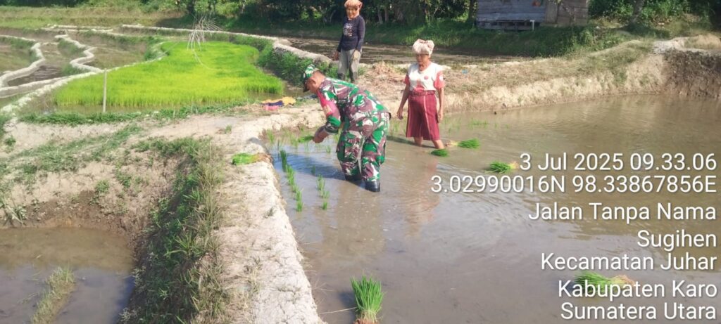 Dukung Ketahanan Pangan Koramil 07 Juhar Bantu Petani Penanaman Padi Sawah