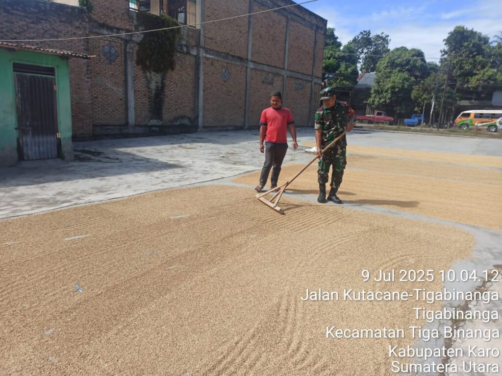 Koramil 08 Tiga Binanga Komsos Sekaligus Bantu Petani Penjemuran Benih Padi