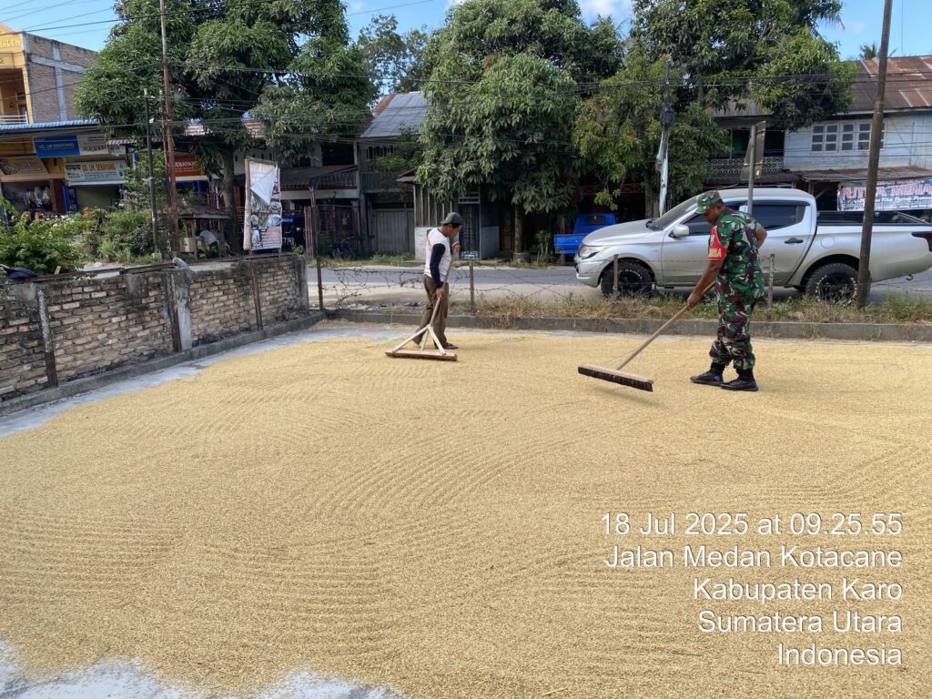 Koramil 08 Tiga Binanga Komsos Sekaligus Bantu Petani Penjemuran Padi