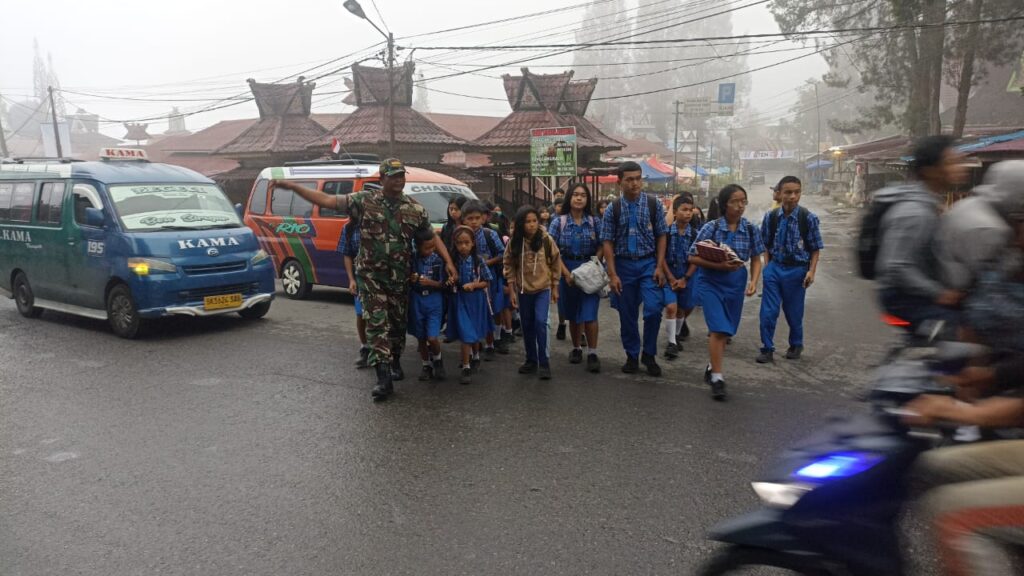 Koramil 03 Berastagi Bantu Pengamanan Penyeberangan Siswa Sekolah GBKP Masehi Berastagi