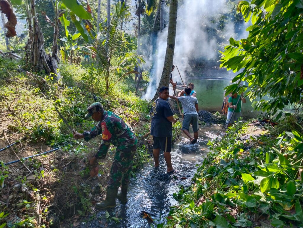 Babinsa Koramil 09 Lau Baleng Bersama Masyarakat Gotong Royong Bersihkan Saluran Air Pemandian Umum Desa