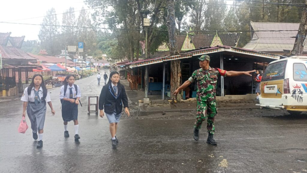 Koramil 03 Berastagi Bantu Pengamanan Penyeberangan Siswa Sekolah GBKP Masehi Berastagi