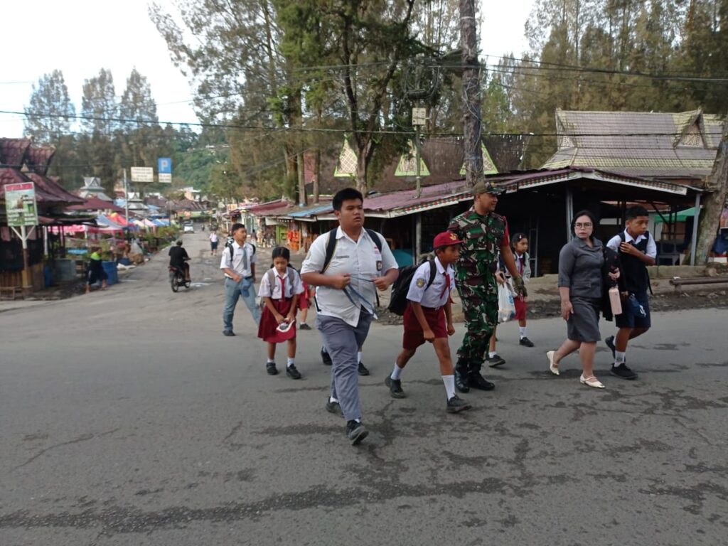 Babinsa Koramil 03 Berastagi Bantu Pengamanan Penyeberangan Siswa Sekolah Yayasan GBKP Masehi di Kec. Berastagi