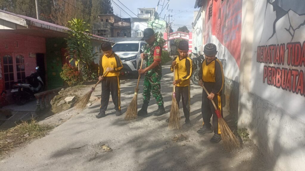 Koramil 03 Berastagi Gotong Royong Bersama Siswa Sekolah Bersihkan Lingkungan Sekolah MIS Al Ittihadiyah Berastagi