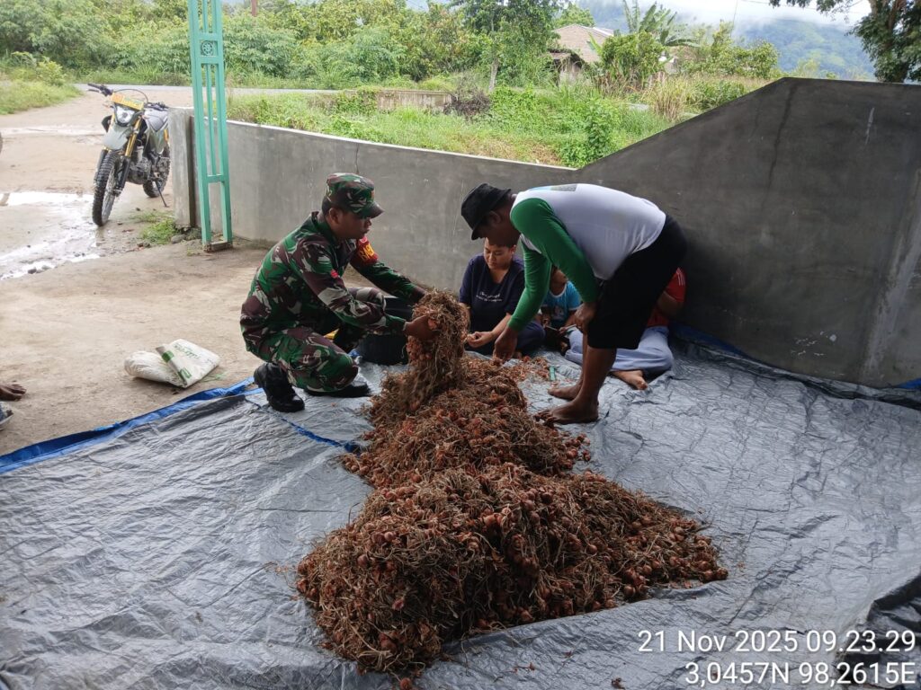 Dukung Ketahanan Pangan Koramil 07 Juhar Bantu Petani Panen Tanaman Bawang Merah