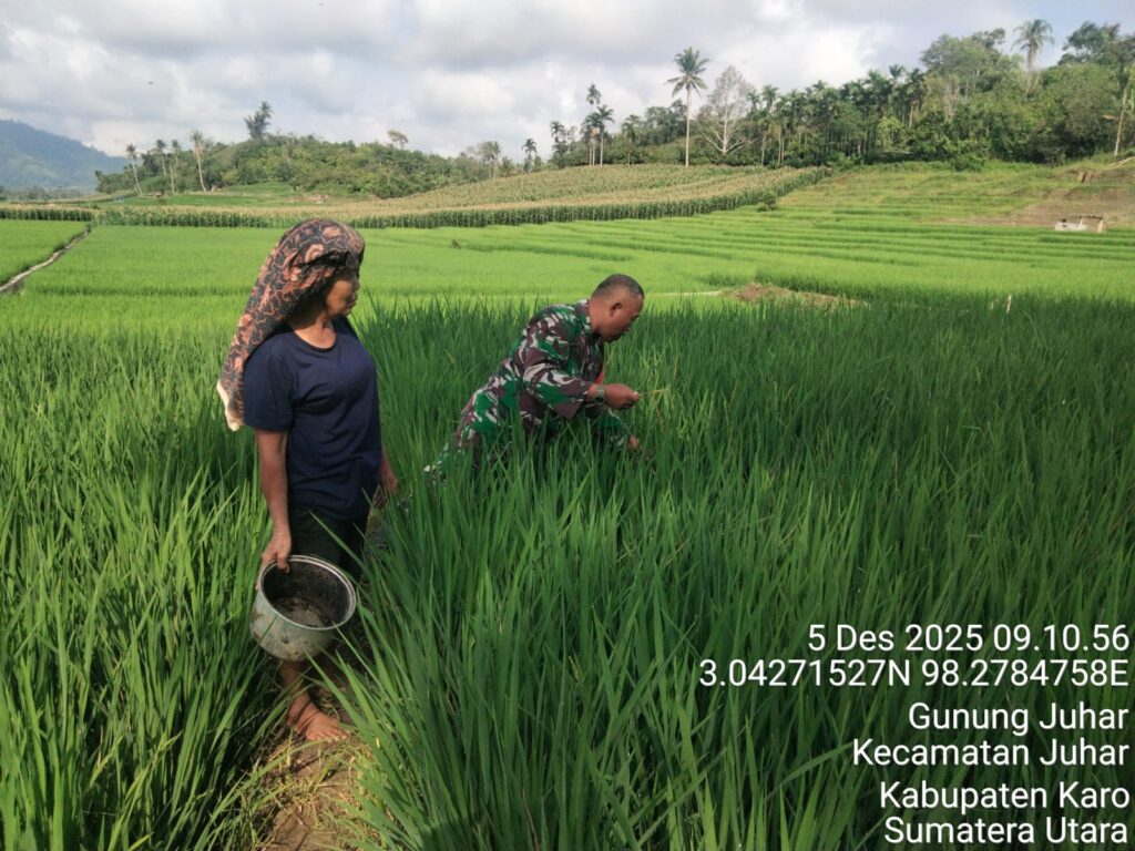 Koramil 07 Juhar Komsos Bersama Petani Pengecekan dan Perawatan Padi