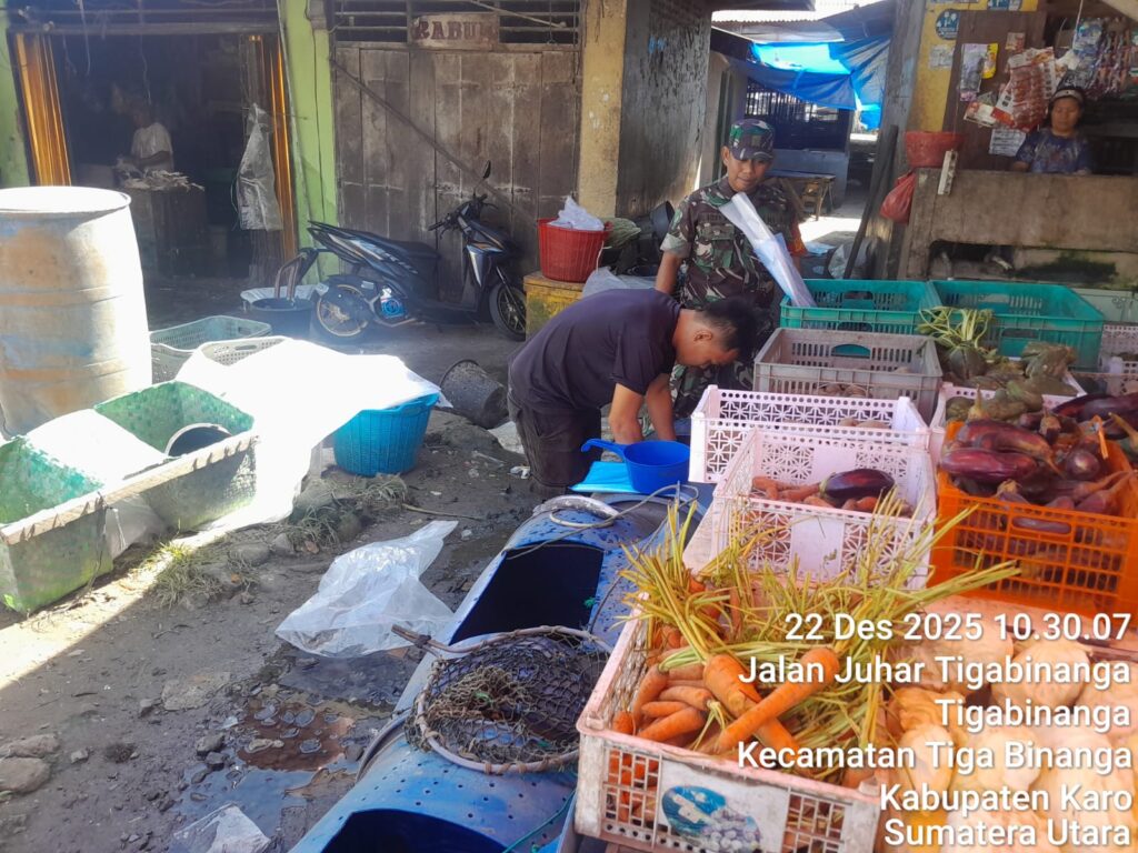 Babinsa Koramil 08 Tiga Binanga Komsos Bersama Pedagang dan Berikan Imbauan Agar Tidak Buang Limbah Sembarangan