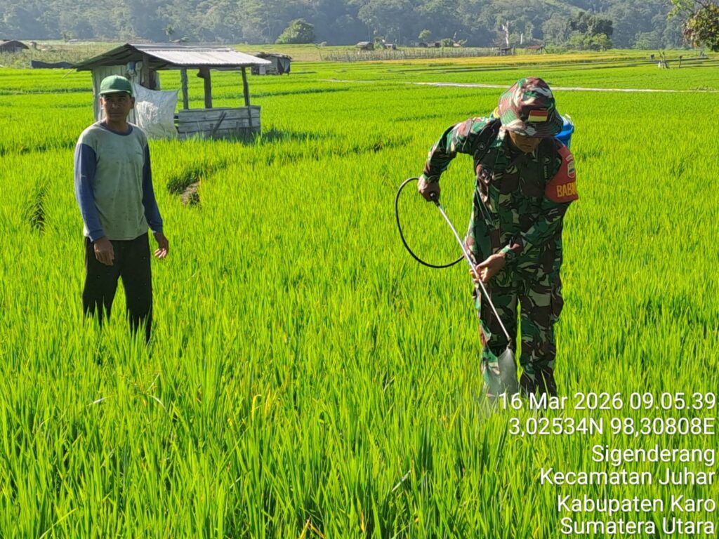 Koramil 07 Juhar Komsos Bersama Petani Pengecekan dan Perawatan Padi