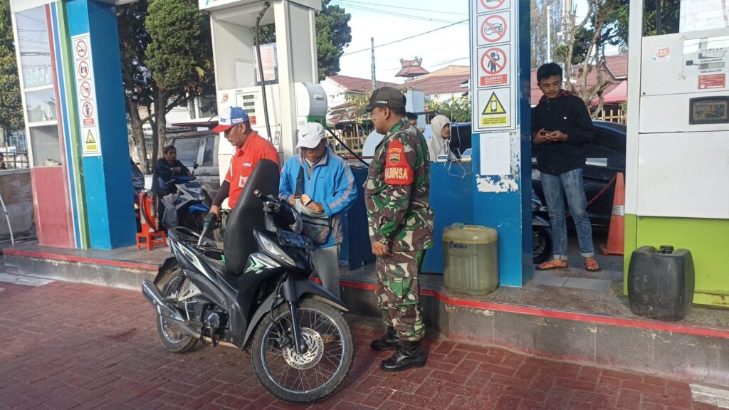 Babinsa Koramil 03 Berastagi Pantau Pengamanan Pengisian BBM di SPBU di Tugu Perjuangan Berastagi