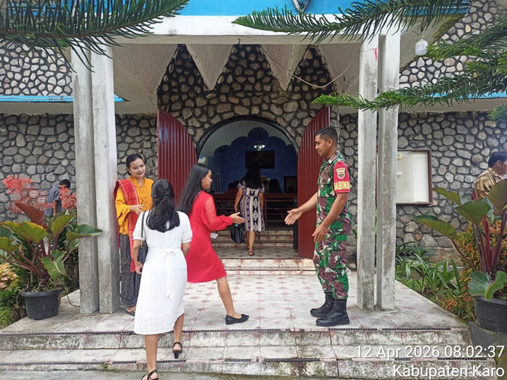 Karo, Jurnaliskaro.com,- Babinsa Koramil 05 Payung Kodim 0205 Tanah Karo, Serda Mukhlis, melaksanakan kegiatan pengamanan kegiatan ibadah gereja di wilayah Kecamatan Tiga Nderket, Kab. Karo, Minggu (12/04/2026) pagi.