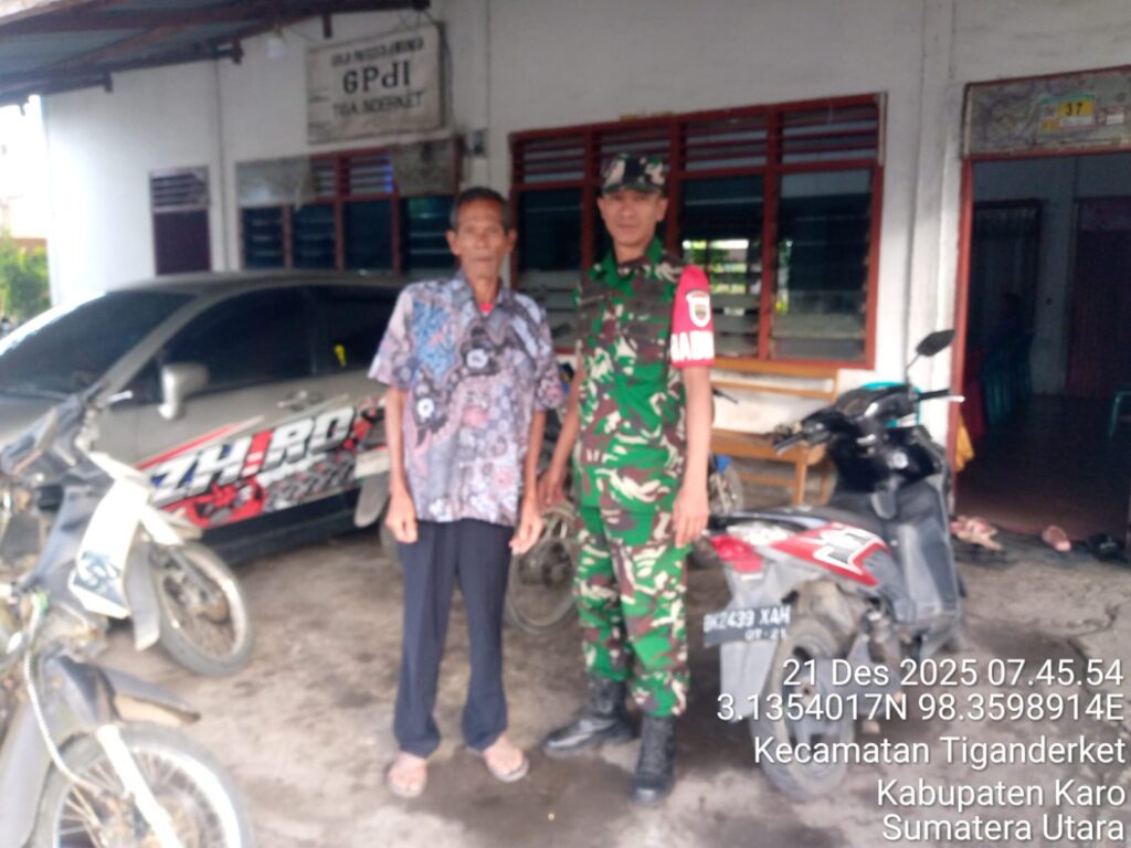 Karo, Jurnaliskaro.com,- Babinsa Koramil 05 Payung Kodim 0205 Tanah Karo, Sertu ES Sembiring, melaksanakan kegiatan pengamanan kegiatan ibadah gereja di wilayah Kecamatan Tiga Nderket, Kab. Karo, Minggu (21/12/2025) pagi.