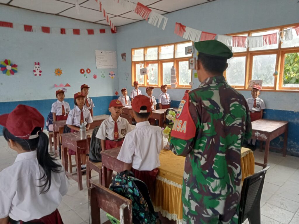 Babinsa Koramil 06 Munte Ajarkan Wasbang Cinta Tanah Air Pada Siswa SD Sejak Dini