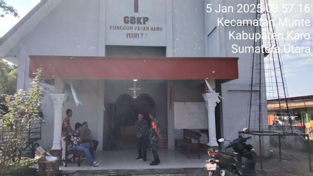 Karo, Jurnaliskaro.com,- Untuk menciptakan suasana yang nyaman dan aman selama beribadah, Babinsa Koramil 06 Munte Kodim 0205 Tanah Karo, bersama dengan personil Babinsa yang lain, melaksanakan kegiatan pengamanan kegiatan ibadah di gereja GBKP Runggun Pasar Baru Munte di Desa Munte Kec. Munte, Kab. Karo, Minggu (05/01/2025) pagi.