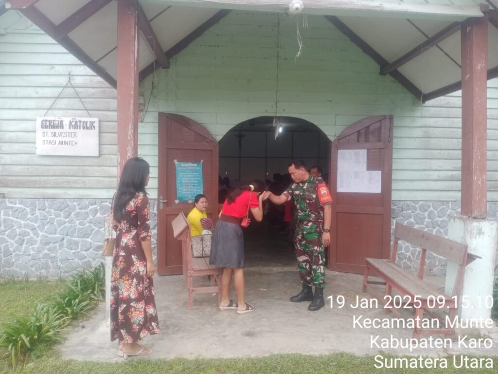 Karo, Jurnaliskaro.com,- Untuk menciptakan suasana yang nyaman dan aman selama beribadah, Babinsa Koramil 06 Munte Kodim 0205 Tanah Karo, bersama dengan personil Babinsa yang lain, melaksanakan kegiatan pengamanan kegiatan ibadah di gereja Katolik di Desa Munte Kec. Munte, Kab. Karo, Minggu (19/01/2025) pagi.
