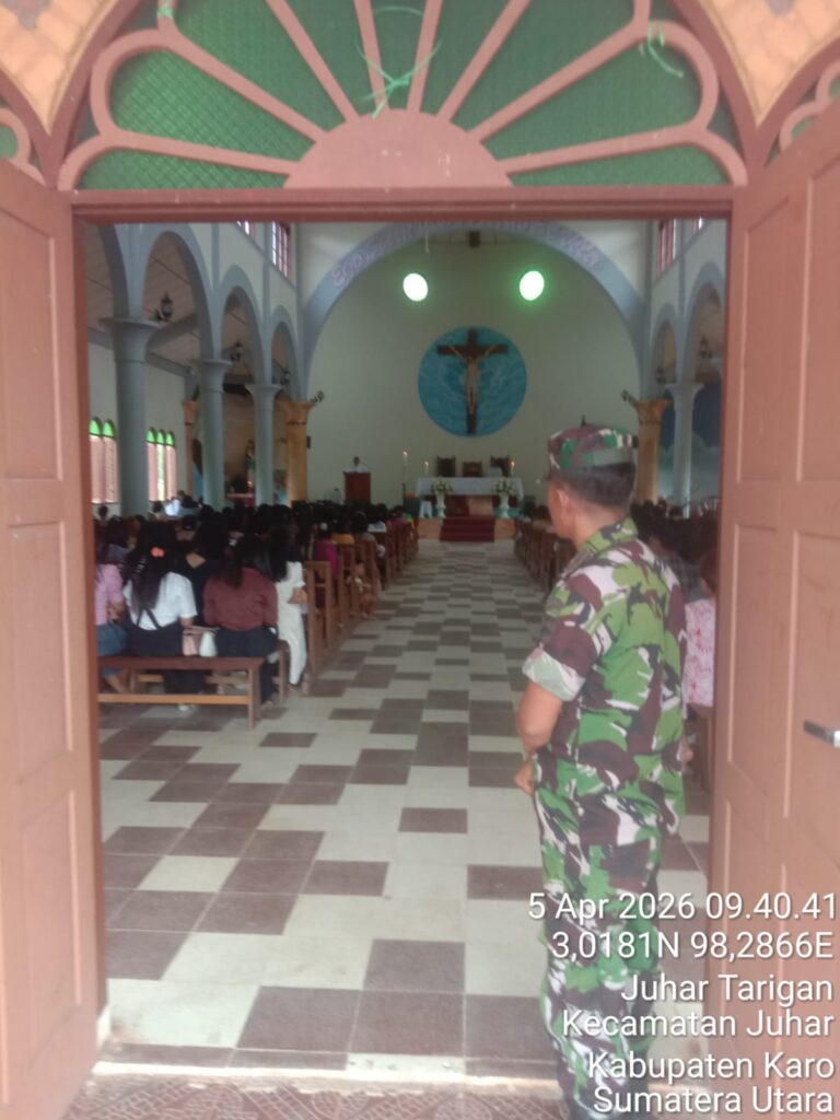 Karo, Jurnaliskaro.com,- Untuk menciptakan suasana yang nyaman dan aman selama beribadah, Babinsa Koramil 07 Juhar Kodim 0205 Tanah Karo, bersama dengan personil Babinsa yang lain, melaksanakan kegiatan pengamanan kegiatan ibadah di gereja St Paulus Juhar di Desa Juhar Tarigan Kec. Juhar, Kab. Karo, Minggu (05/04/2026) pagi.