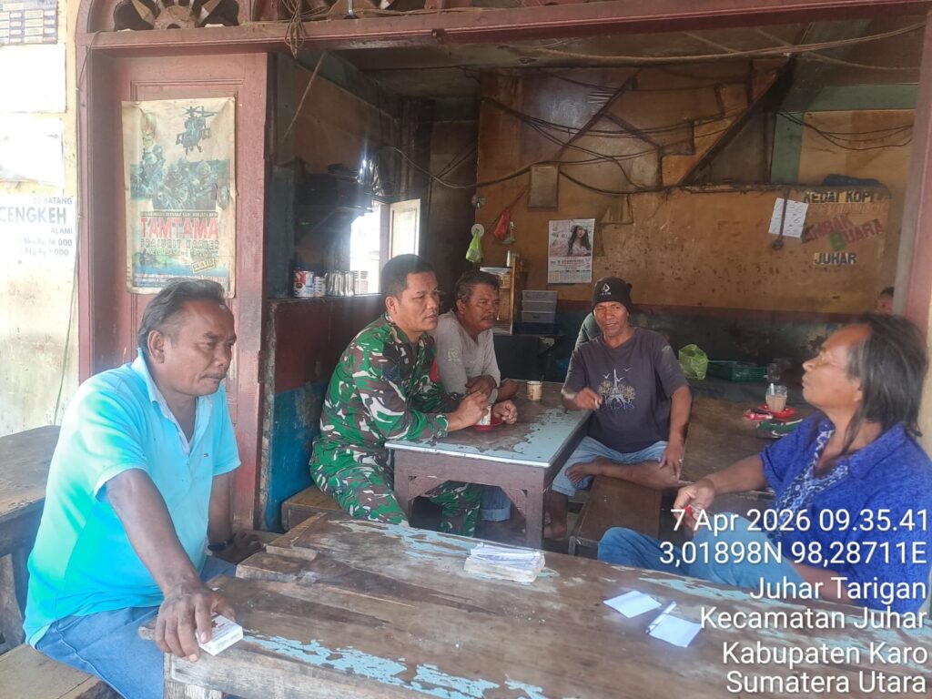 Karo, Jurnaliskaro.com,- Untuk menciptakan situasi yang aman, kondusif dan bersih, Koramil 07 Juhar Kodim 0205 Tanah Karo melaksanakan Komunikasi Sosial (Komsos) bersama warga di Desa Juhar Tarigan Kec. Juhar, Karo, Selasa (07/04/2026) siang.