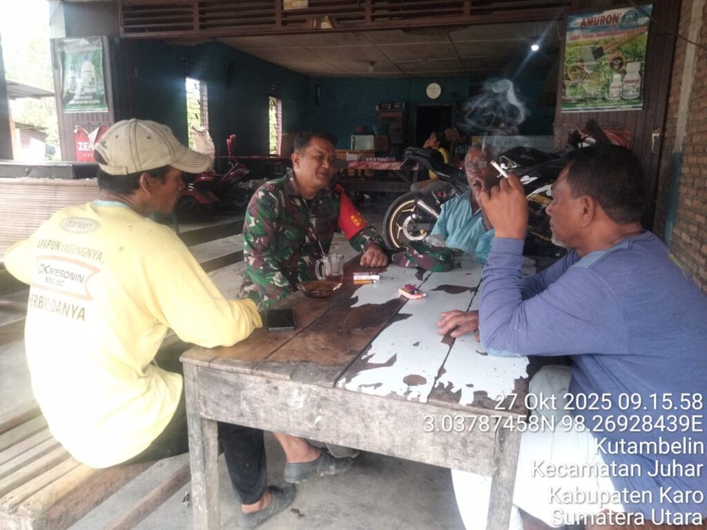 Karo, Jurnaliskaro.com,- Untuk menciptakan situasi yang aman, kondusif dan bersih, Koramil 07 Juhar Kodim 0205 Tanah Karo melaksanakan Komunikasi Sosial (Komsos) bersama warga di Desa Keriahen Kec. Juhar, Karo, Senin (27/10/2025) siang.