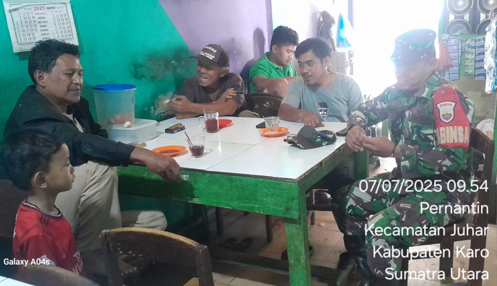 Karo, Jurnaliskaro.com,- Untuk menciptakan situasi yang aman, Koramil 07 Juhar Kodim 0205 Tanah Karo melaksanakan Komunikasi Sosial (Komsos) di Desa Pernantin Kec. Juhar, Senin (07/07/2025) siang.