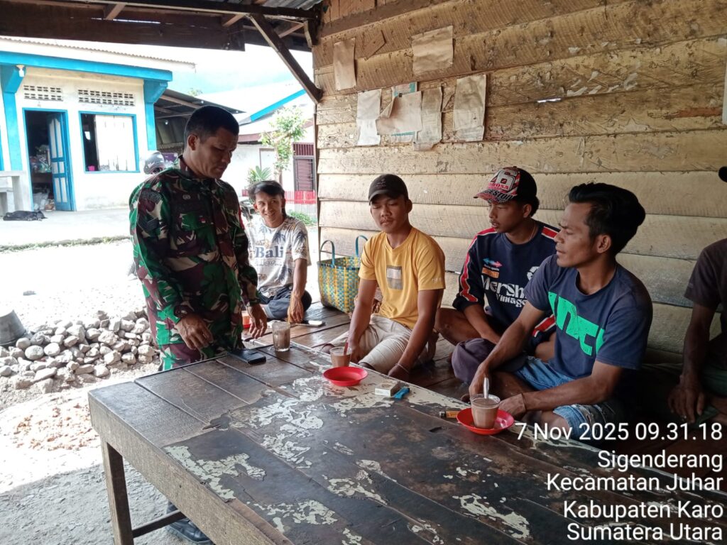 Karo, Jurnaliskaro.com,- Untuk menciptakan situasi yang aman, kondusif dan bersih, Koramil 07 Juhar Kodim 0205 Tanah Karo melaksanakan Komunikasi Sosial (Komsos) bersama warga di Desa Sigenderang Kec. Juhar, Karo, Jumat (07/11/2025) siang.