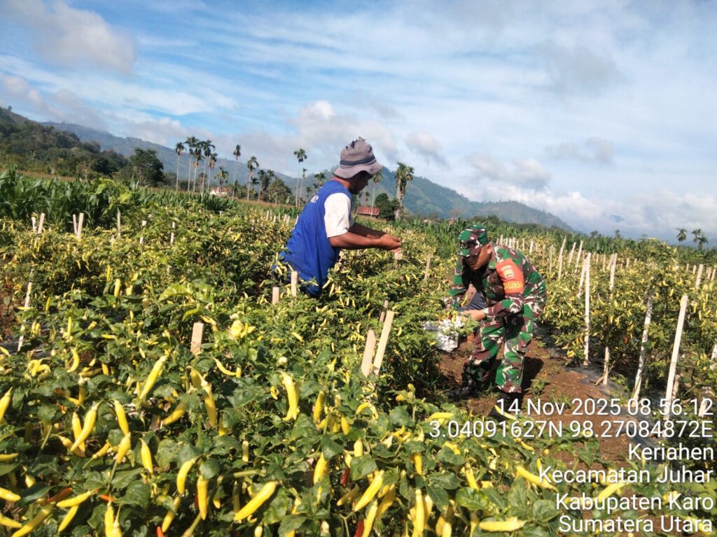 Dalam kegiatan tersebut Babinsa Koramil 07 Juhar Serda Iwan Sinaga, melaksanakan komsos dengan masyarakat khususnya petani yang sedang panen tanaman cabai caplak miliknya. Selain untuk menjadikan pemasukan petani, dan juga untuk mendukung program ketahanan pangan.