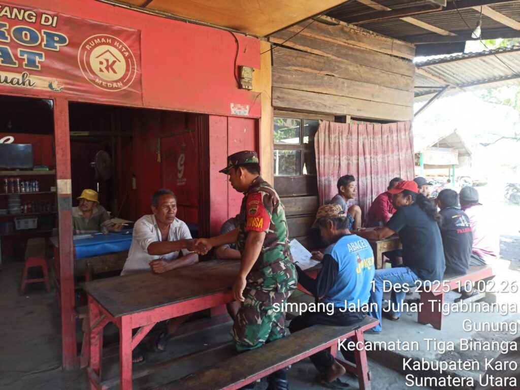Karo, Jurnaliskaro.com,- Untuk menciptakan situasi yang aman, kondusif dan bersih, Koramil 08 Tiga Binanga Kodim 0205 Tanah Karo melaksanakan Komunikasi Sosial (Komsos) bersama warga di Desa Gunung Kec. Tiga Binanga, Karo, Senin (01/12/2025) siang.