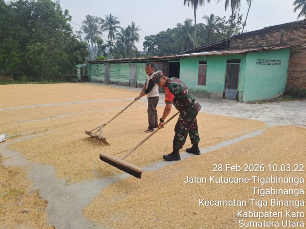 Karo, Jurnaliskaro.com,- Dalam upaya mendukung program pemerintah dalam hal ketahanan pangan Koramil 08 Tiga Binanga Kodim 0205 Tanah Karo membantu masyarakat binaan khususnya petani padi di kilang padi S. Selian di Kel. Tiga Binanga Kec. Tiga Binanga, Sabtu (28/02/2026) pagi.