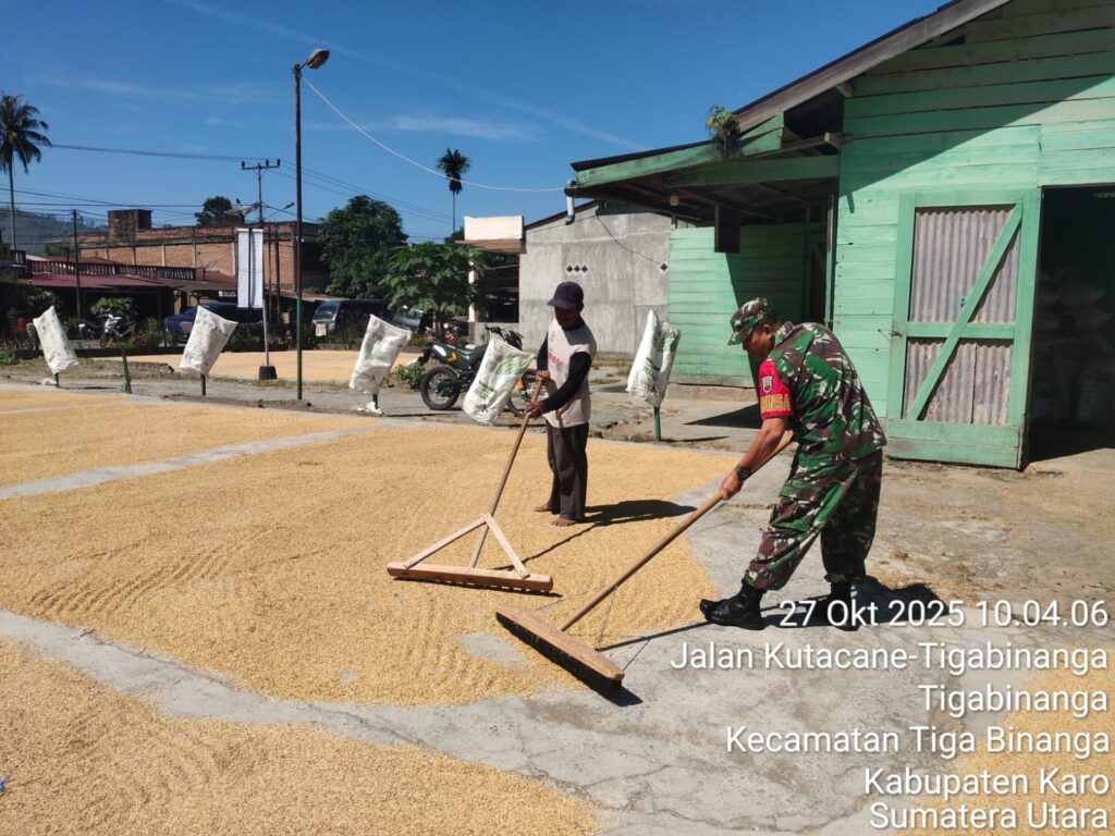 Karo, Jurnaliskaro.com,- Dalam upaya mendukung program pemerintah dalam hal ketahanan pangan Koramil 08 Tiga Binanga Kodim 0205 Tanah Karo membantu masyarakat binaan khususnya petani padi di kilang padi S. Selian di Kel. Tiga Binanga Kec. Tiga Binanga, Senin (27/10/2025) pagi.