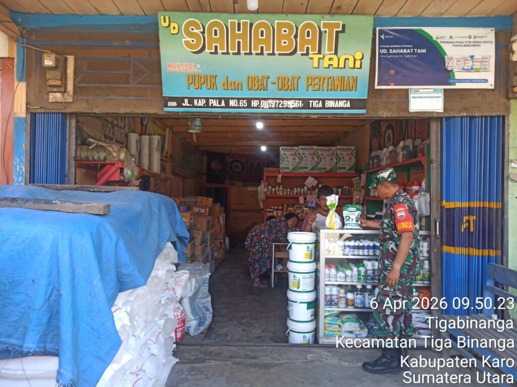 Karo, Jurnaliskaro.com,- Dalam rangka mendukung program pemerintah dalam bidang ketahanan pangan, Koramil 08 Tiga Binanga Kodim 0205 Tanah Karo melaksanakan kegiatan pengecekan ketersediaan pupuk bersubsidi dan non subsidi serta obat obatan tanaman pertanian di toko pupuk UD Sahabat Tani di Kel. Tiga Binanga Kec. Tiga Binanga, Senin (06/04/2026) siang.