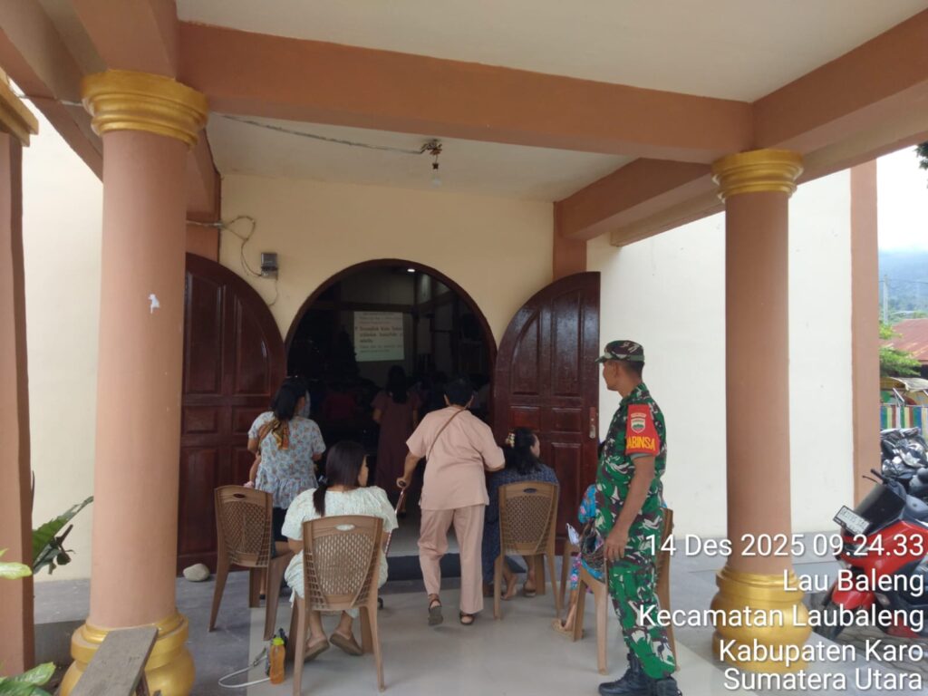 Karo, Jurnaliskaro.com,- Untuk menciptakan suasana yang nyaman dan aman selama beribadah, Babinsa Koramil 09 Lau Baleng Kodim 0205 Tanah Karo, melaksanakan kegiatan pengamanan kegiatan ibadah di gereja HKBP di Desa Lau Baleng Kec. Lau Baleng, Kab. Karo, Minggu (14/12/2025) pagi.