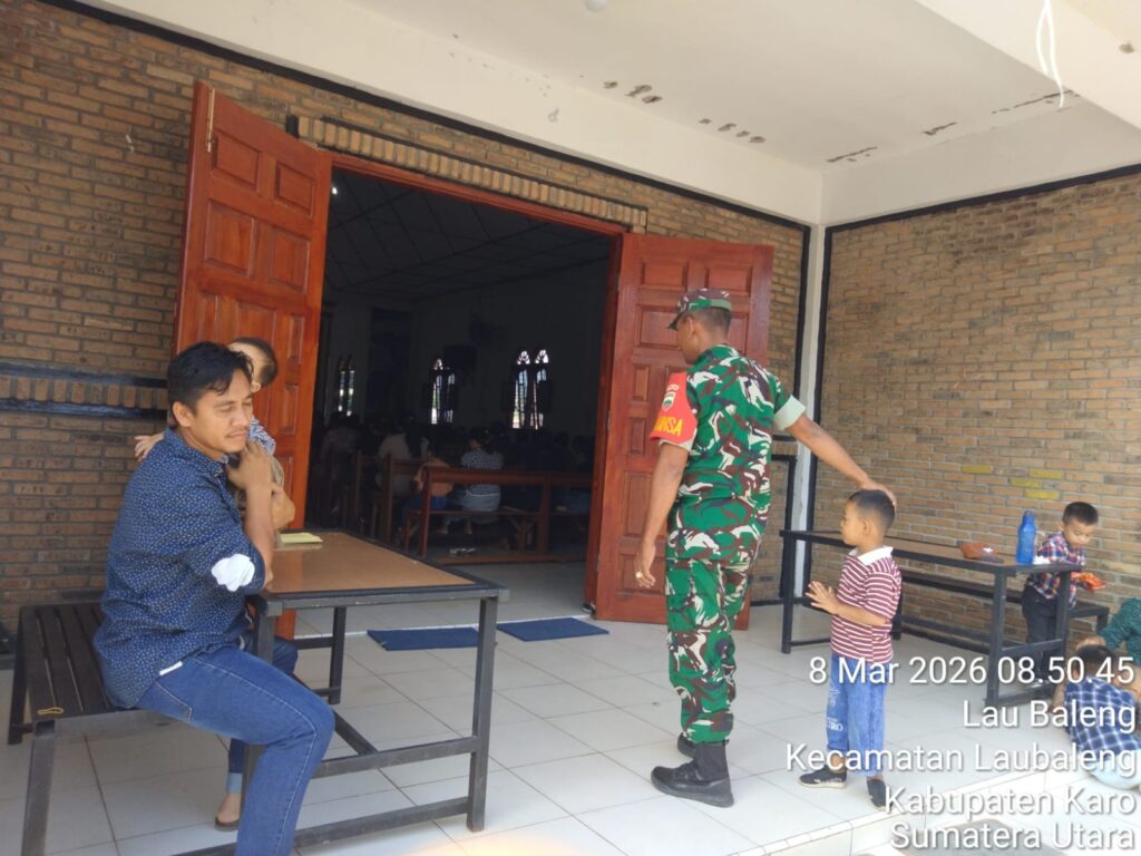 Karo, Jurnaliskaro.com,- Untuk menciptakan suasana yang nyaman dan aman selama beribadah, Babinsa Koramil 09 Lau Baleng Kodim 0205 Tanah Karo, melaksanakan kegiatan pengamanan kegiatan ibadah di gereja Katolik Santo Dominikus di Desa Lau Baleng Kec. Lau Baleng, Kab. Karo, Minggu (08/03/2026) pagi.