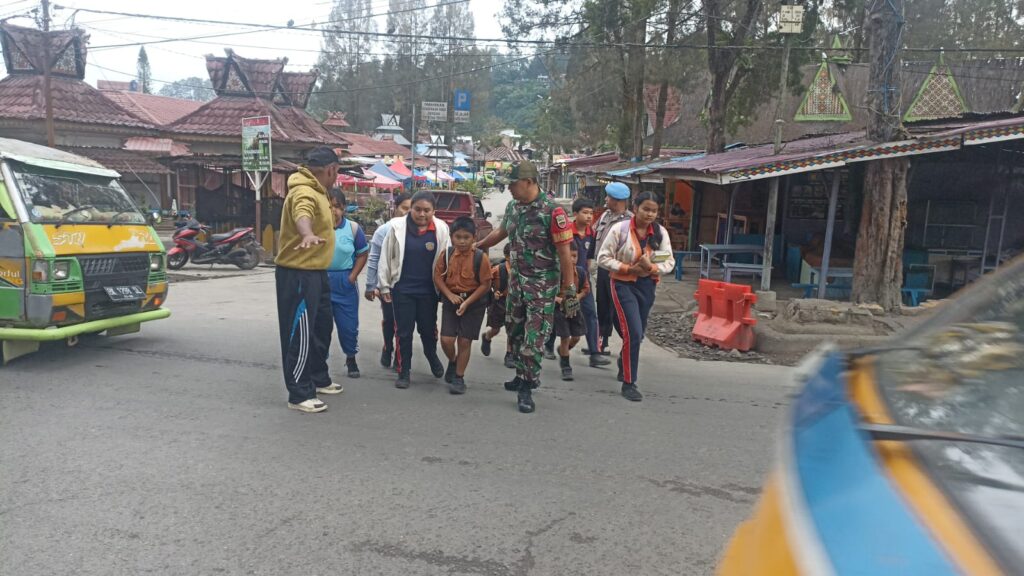 Babinsa Koramil 03 Berastagi Bantu Pengamanan Penyeberangan Siswa Sekolah Yayasan GBKP Masehi di Kec. Berastagi
