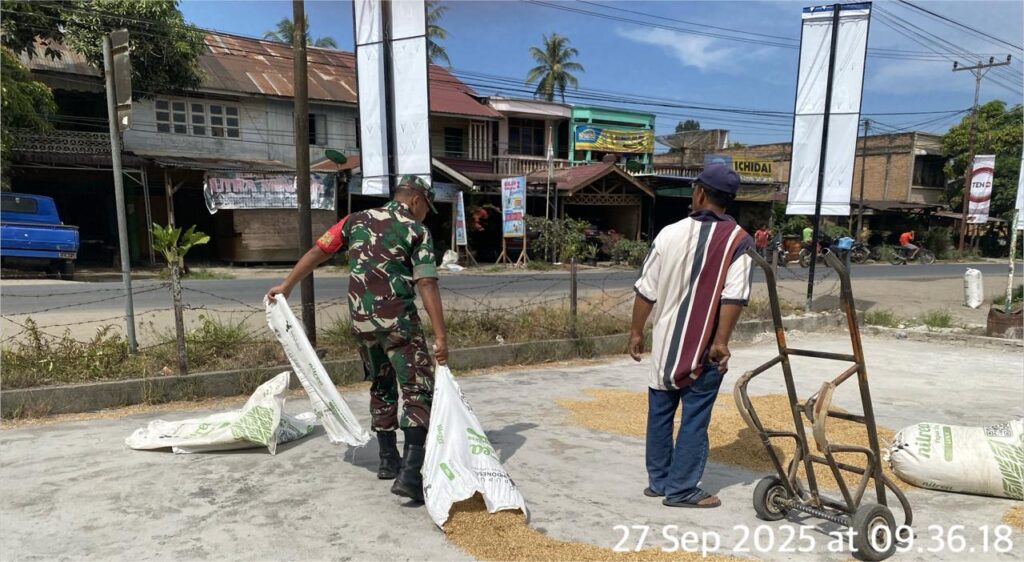 Babinsa Koramil 08 Tiga Binanga Komsos Sekaligus Bantu Petani Penjemuran Padi