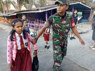 Koramil 03 Berastagi Bantu Pengamanan Penyeberangan Siswa Sekolah Yayasan GBKP Masehi di Kec. Berastagi