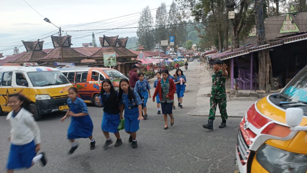 Koramil 03 Berastagi Bantu Pengamanan Penyeberangan Siswa Sekolah Yayasan GBKP Masehi di Kec. Berastagi