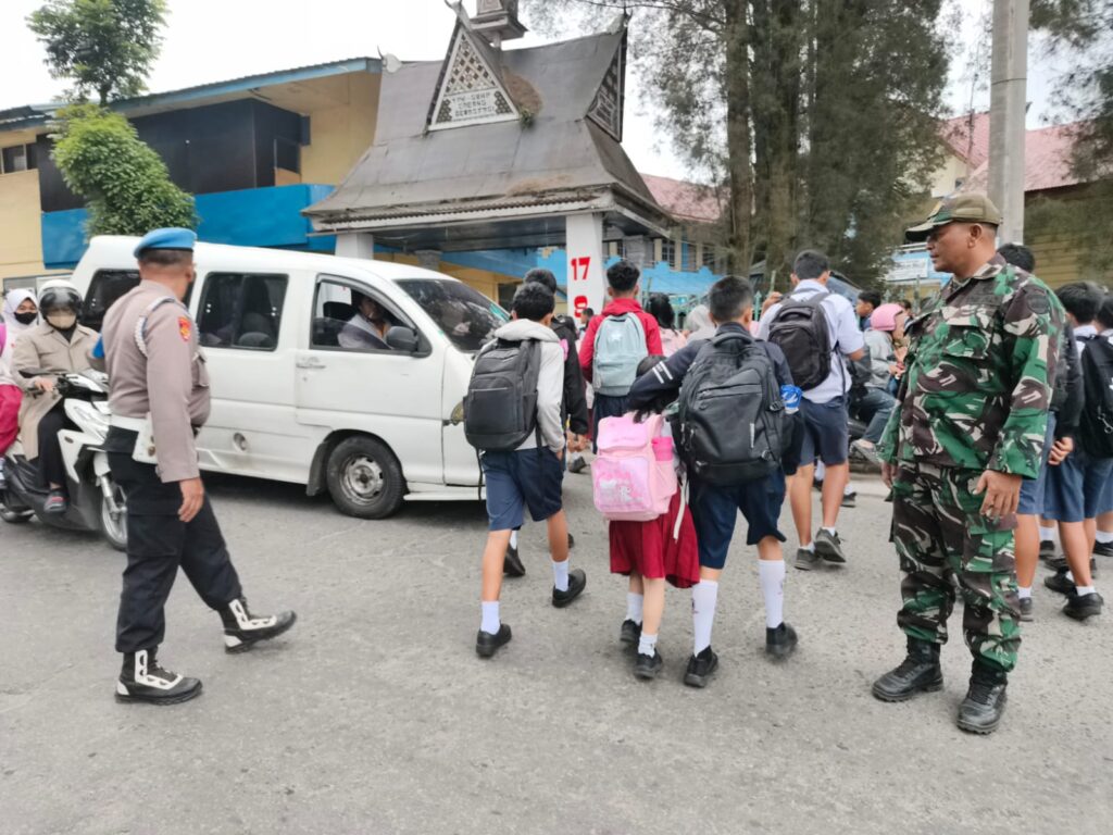 Koramil 03 Berastagi Bantu Pengamanan Penyeberangan Siswa Sekolah Yayasan GBKP Masehi di Kec. Berastagi
