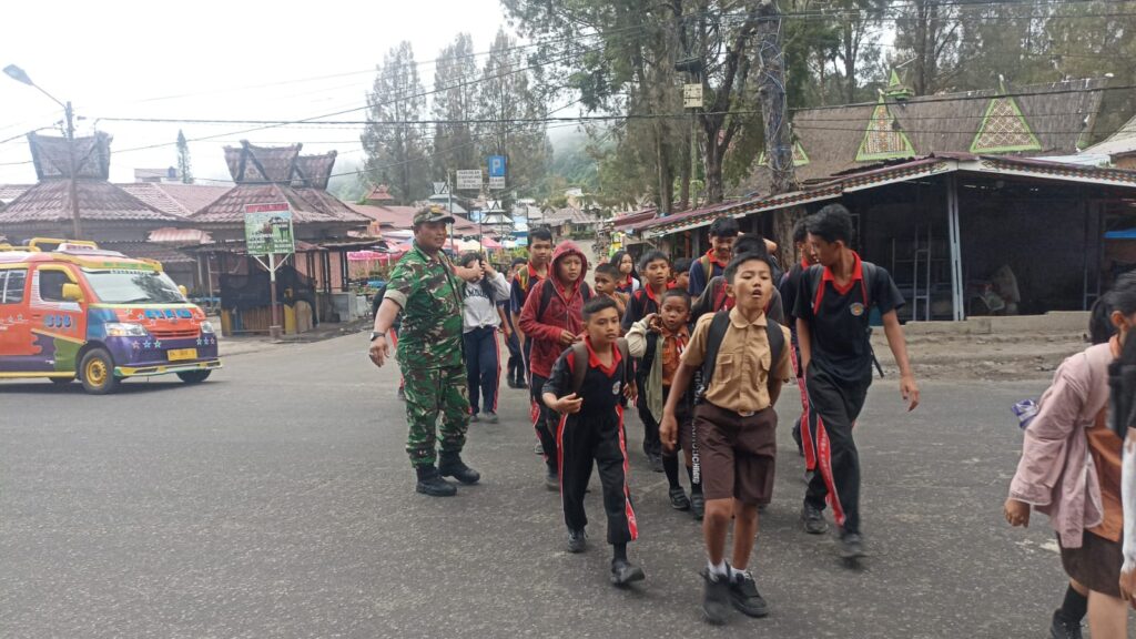 Babinsa Koramil 03 Berastagi Bantu Pengamanan Penyeberangan Siswa Sekolah GBKP Masehi Berastagi