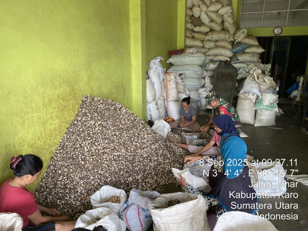Babinsa Koramil 08 Tiga Binanga Giat Bantu Petani Pengolahan Hasil Pertanian Pengupasan Kemiri