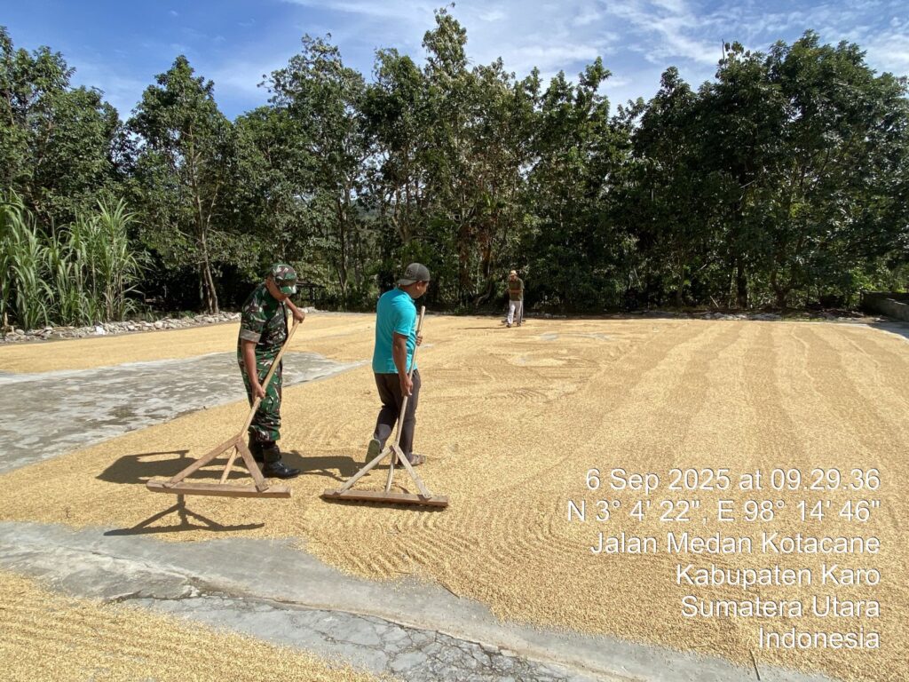 Babinsa Koramil 08 Tiga Binanga Komsos Sekaligus Bantu Petani Penjemuran Padi