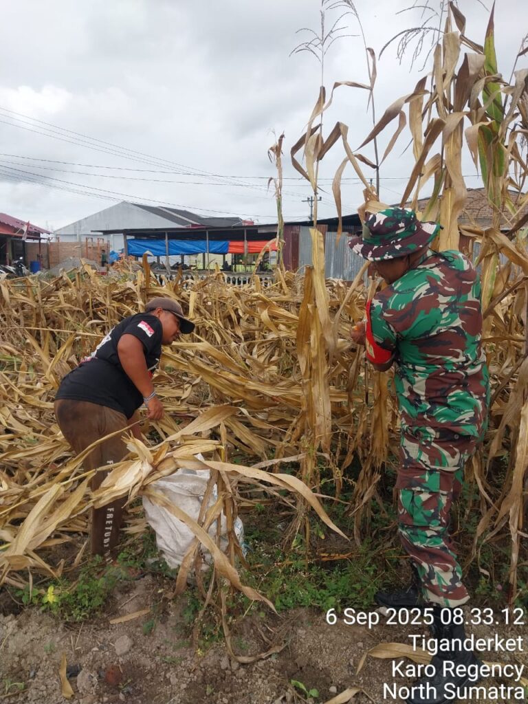 Dukung Ketahanan Pangan Babinsa Koramil 05 Payung Bantu Petani Panen Jagung di Desa Tiga Nderket
