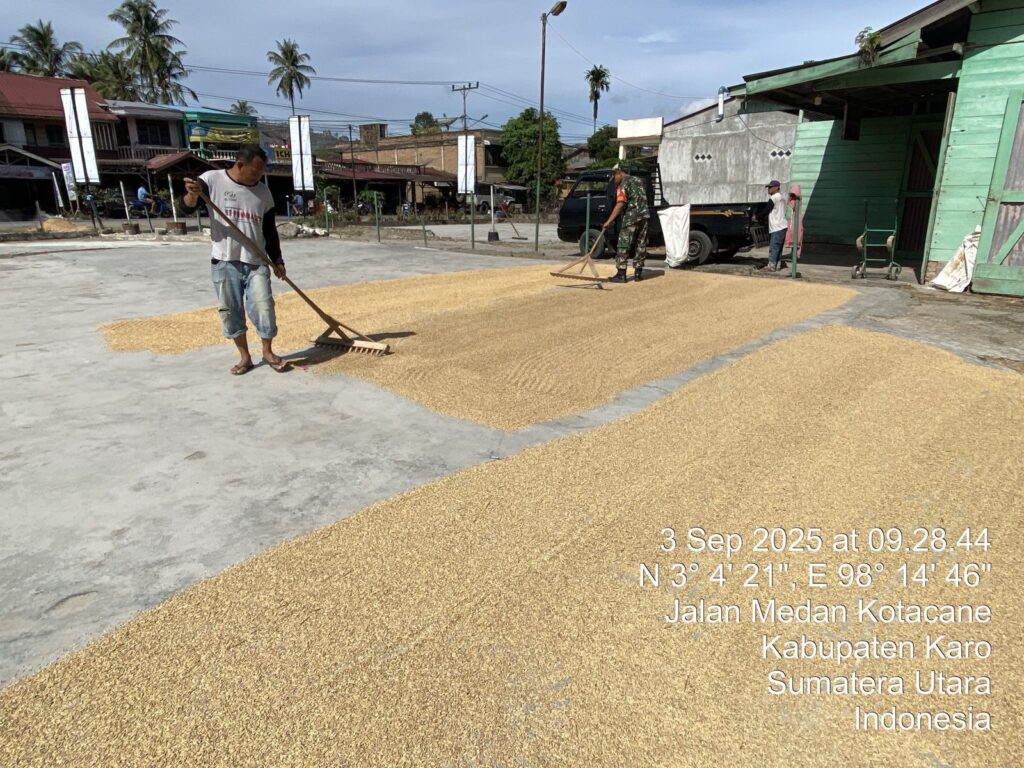 Koramil 08 Tiga Binanga Komsos Sekaligus Bantu Petani Penjemuran Padi