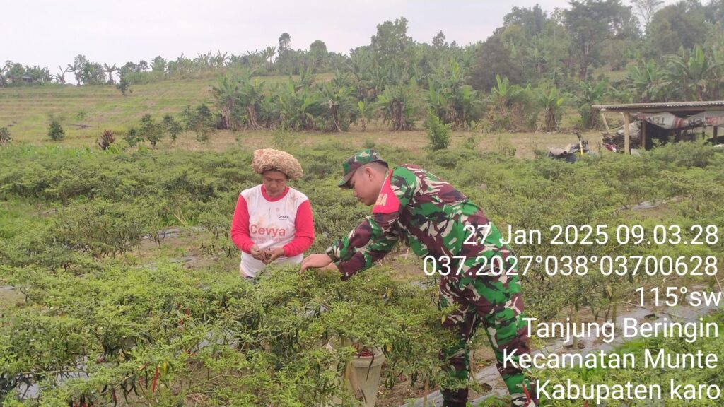 Karo, Jurnaliskaro.com,- Jalin kebersamaan dan sinergitas antara masyarakat dengan TNI, Koramil 06 Munte Kodim 0205 Tanah Karo membantu warga binaan yang sedang melakukan penanaman tanaman cabai di Desa Tanjung Beringin Kec. Munte, Senin (27/01/2025) pagi.