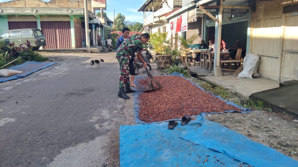 Dalam kegiatan tersebut, Babinsa Koramil 06 Munte Sertu M. Sebayang, melaksanakan kegiatan penjemuran tanaman coklat atau kakao hasil panen milik petani.