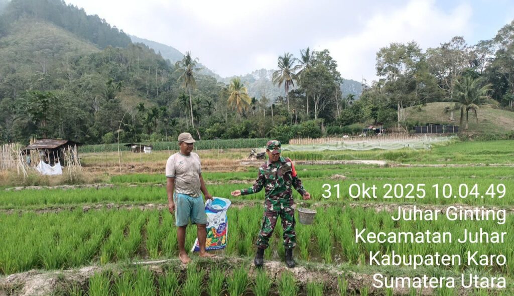 Karo, Jurnaliskaro.com,- Dukung program Ketahanan Pangan sekaligus menjalin kebersamaan dan sinergitas antara masyarakat dengan TNI, Koramil 07 Juhar Kodim 0205 Tanah Karo membantu petani perawatan lahan pertanian di Desa Juhar Tarigan Kec. Juhar, Jumat (31/10/2025) pagi.