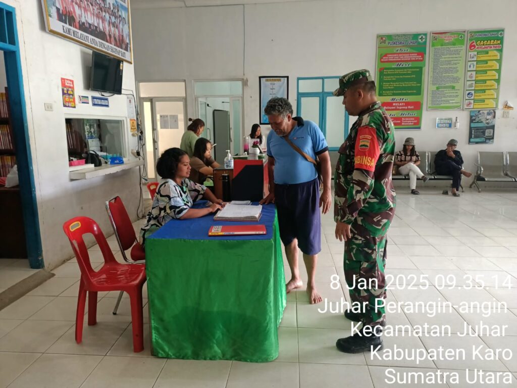 Babinsa Koramil 07 Juhar Serda Iwan Sinaga, mendengar informasi bahwasanya ada warga yang sakit. Dan kemudian dirinya pun berinisiatif mendatangi warga dan membawanya ke Puskesmas.