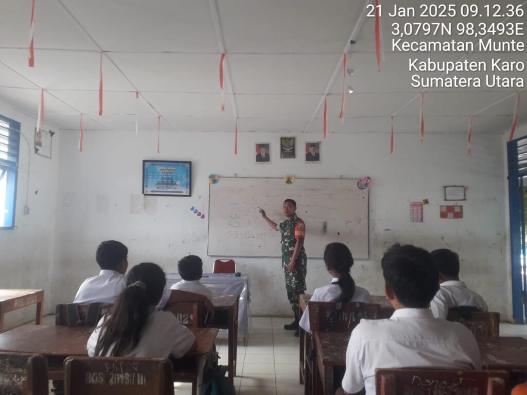 Karo, Jurnaliskaro.com,- Koramil 06 Munte Kodim 0205 Tanah Karo memberikan pemahaman akan Wawasan Kebangsaan kepada siswa dan siswi SMP Negeri 1 Munte di Kec. Munte, Selasa (21/01/2025) siang.