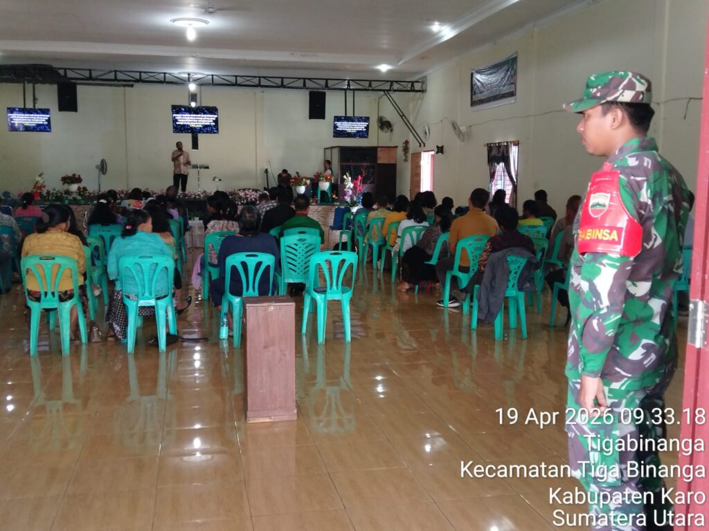 Karo, Jurnaliskaro.com,- Untuk menciptakan suasana yang nyaman dan aman selama beribadah, Babinsa Koramil 08 Tiga Binanga Kodim 0205 Tanah Karo, bersama dengan personil Babinsa yang lain, melaksanakan kegiatan pengamanan kegiatan ibadah di gereja GBI di Kel. Tiga Binanga Kec. Tiga Binanga, Kab. Karo, Minggu (19/04/2026) pagi.