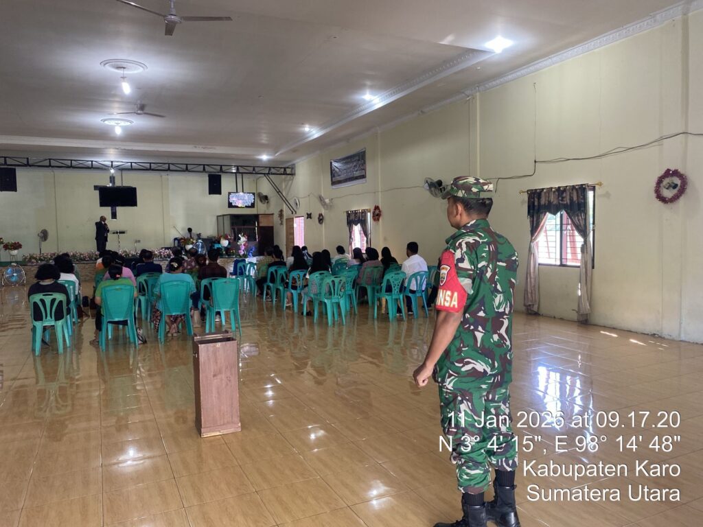 Karo, Jurnaliskaro.com,- Untuk menciptakan suasana yang nyaman dan aman selama beribadah, Babinsa Koramil 08 Tiga Binanga Kodim 0205 Tanah Karo, bersama dengan personil Babinsa yang lain, melaksanakan kegiatan pengamanan kegiatan ibadah di gereja GBI di Kel. Tiga Binanga Kec. Tiga Binanga, Kab. Karo, Minggu (11/01/2026) pagi.